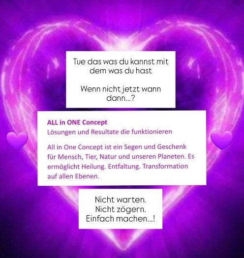All in One Concept ist ein Segen und Geschenk für Mensch, Tier, Natur und unseren Planeten. Es ermöglicht Heilung. Entfaltung. Transformation auf allen Ebenen.
